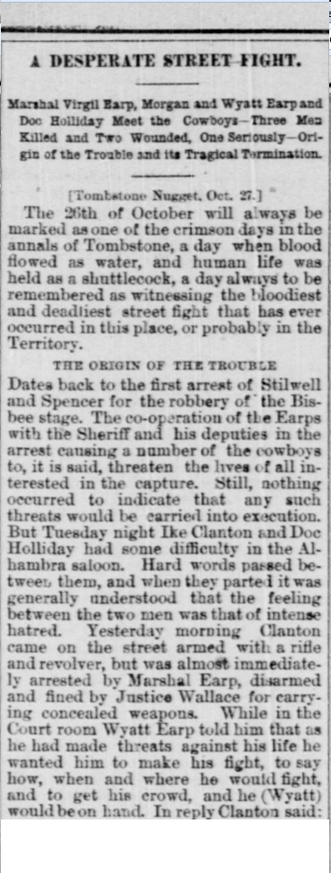 Now just about everyone who has knowledge of the Old West knows that there was a shoot out at the OK Corral. Tombstone, the gunfight and Wyatt Earp have been glorified in many movies, TV shows and books over the years. But have you ever seen a written account from that time period that gives you the newspaper report? I hadn’t seen one until I did the search of the Library of Congress website. On the website I found a long article about what happened and what led up to the fight. The article is a copy of the one written up in the Tombstone Nugget which was a daily paper that was printed in Tombstone during that time period. The article was reprinted in a Tucson paper, The Arizona Weekly Citizen, on October 30 1881 4 days after the shoot out happened. I have copied a portion of the article here but if you would like go read the article in the Citizen then click on the link. The article is at the start of the seventh column.