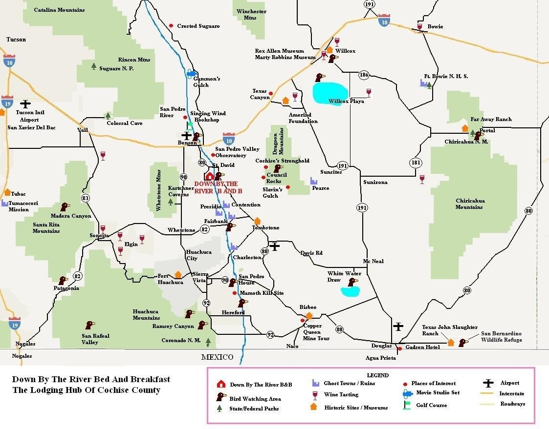 Down By The River Bed and Breakfast lies just to the north of the San Pedro National Riparian Conservation Area on the banks of the San Pedro River. There is easy access to the San Pedro River from the property for birding enthusiasts.