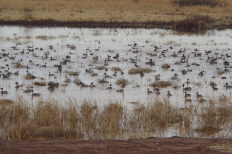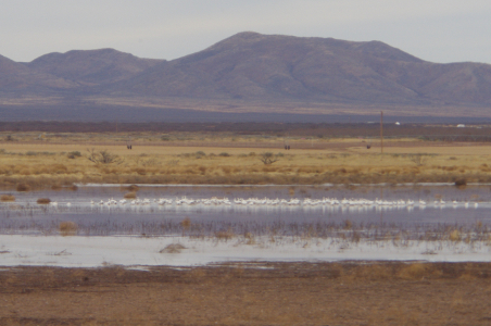 White Water Draw is a birder’s paradise during the late fall, winter and early spring. This place is located in Cochise County about an hour south and east of Down By The River B and B. The 1400 acre site has been owned by Arizona Game and Fish Department since 1997 when it was purchased from the Hyannis Cattle Company. About 700 acres is wetland and is known as a wintering area for Sand Hill Cranes and Snow Geese. After talking with guests Barb and I had gone to the area during the early spring after we had first opened the B & B 8 years ago. Angie had never been there, so at the beginning of February we had a chance to sneak away for a couple of hours before our next guests were to arrive at the B & B for check in. We really were looking forward to this and I wanted to have the chance to get some good pictures of the action there.