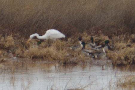 As we walked along the levee, we came to one of the viewing platforms constructed at the water’s edge. The platform has free for use, large magnifying glasses that you can use to look at the birds. While at the viewing platform, we saw a Loggerhead Shrike right below us. He was camera shy. Every time I tried to get the shot, he would hear the camera focus quickly duck into the reeds and become almost invisible. I noticed the Snow Geese and shot some pictures of them grouped on the water. After my shot, I looked through the glasses that were provided to see them better. It was much better than my lens. Then I thought that maybe I could get a shot through the magnifier to get an idea of a comparison of my lens to the viewer. It wasn’t a real sharp picture because I was attempting to focus through another optical instrument. I was semi successful and you can see in comparing the two pictures it does give you an idea of what the magnifiers can do.